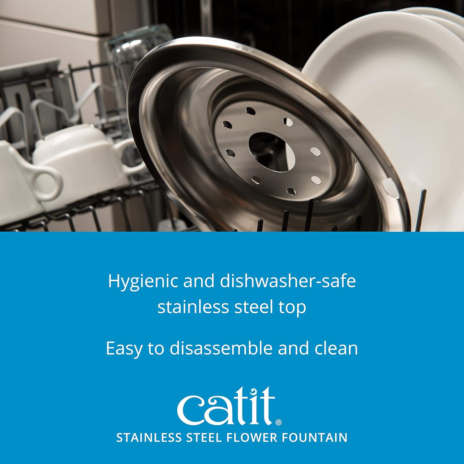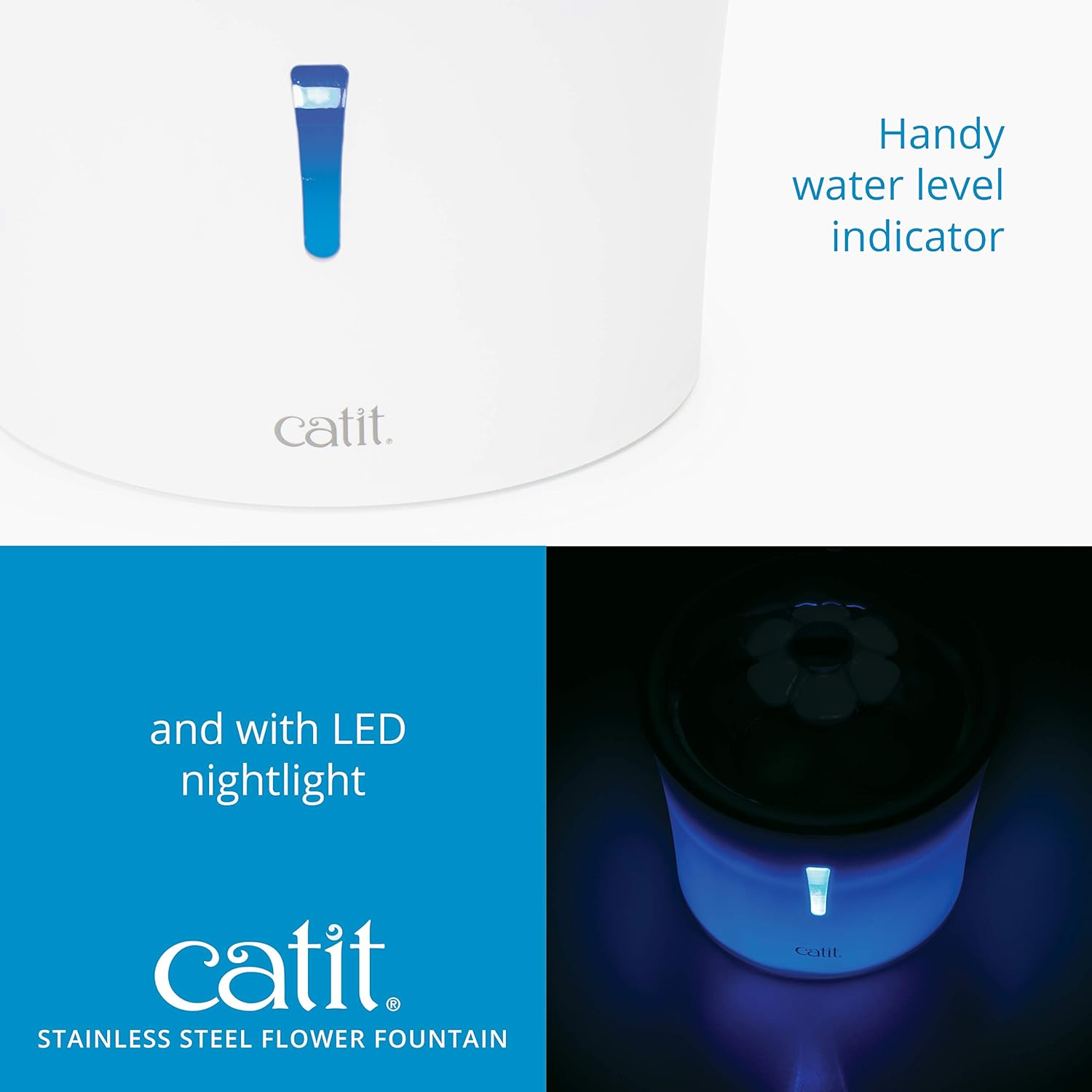 From the Catit range, this Stainless Steel Drinking Fountain provides cats and kittens with a continuous source of pure, fresh water. Featuring a hygienic, high-grade stainless-steel top that is BPA-free, it includes a water level indicator with LED nightlight for ease of use. The triple action filter keeps water clean by filtering out debris, removing odours and impurities, and softening tap water to help reduce magnesium and calcium levels, which can contribute to urinary tract disease. With a generous 3-litre capacity and a compact 18cm (7") diameter, this stylish fountain is ideal for encouraging healthy hydration in all cats.