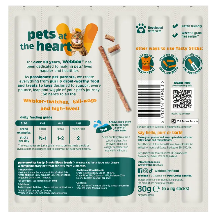 From the webbox range. Made with fresh meat. Ideal for all cats & kittens over 3 months. New cheese flavour, sure to get your furry purring. Uk made with no artificial colours. Wheat & grain free. Individually wrapped for lasting freshness. 30g per pack – 6 sticks.