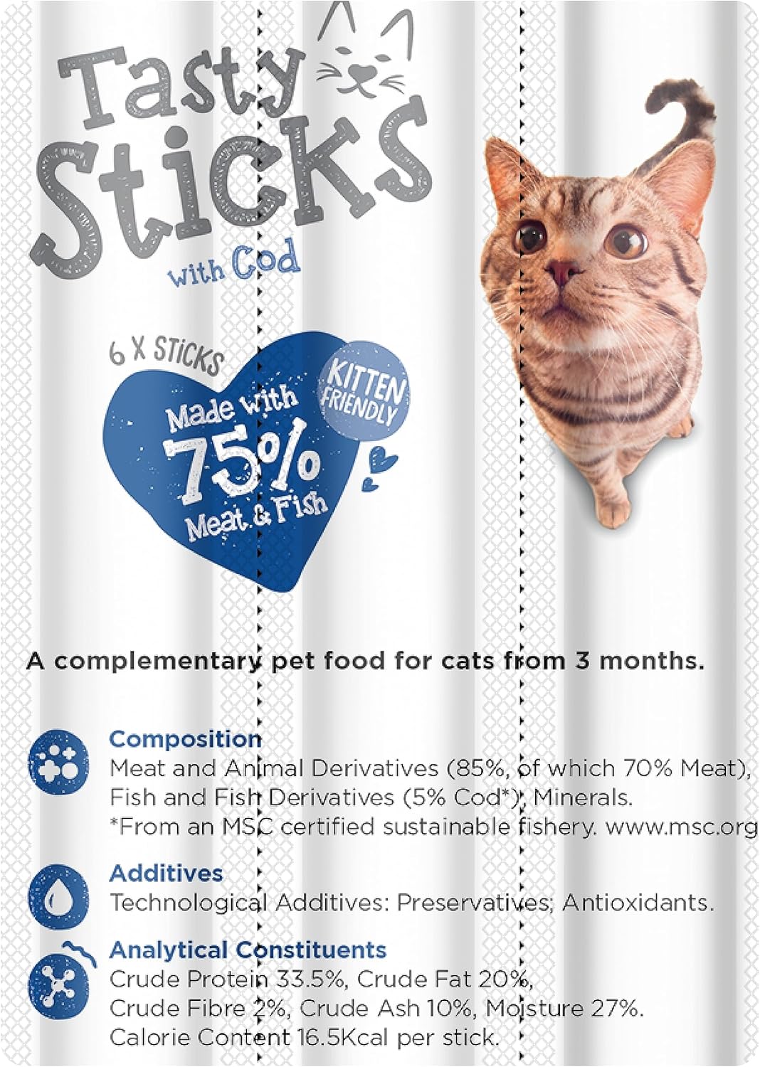 From a renown brand. Bringing treats your cat or kitten will love. Each stick is individually packaged for freshness. Made without cereals. Made with 95% meat. Ideal for all cats & kittens. Can be fed anytime as a treat. Moist meaty treats your furry friend won't be able to resist. Each pack weighs 30g & contains 6 sticks.