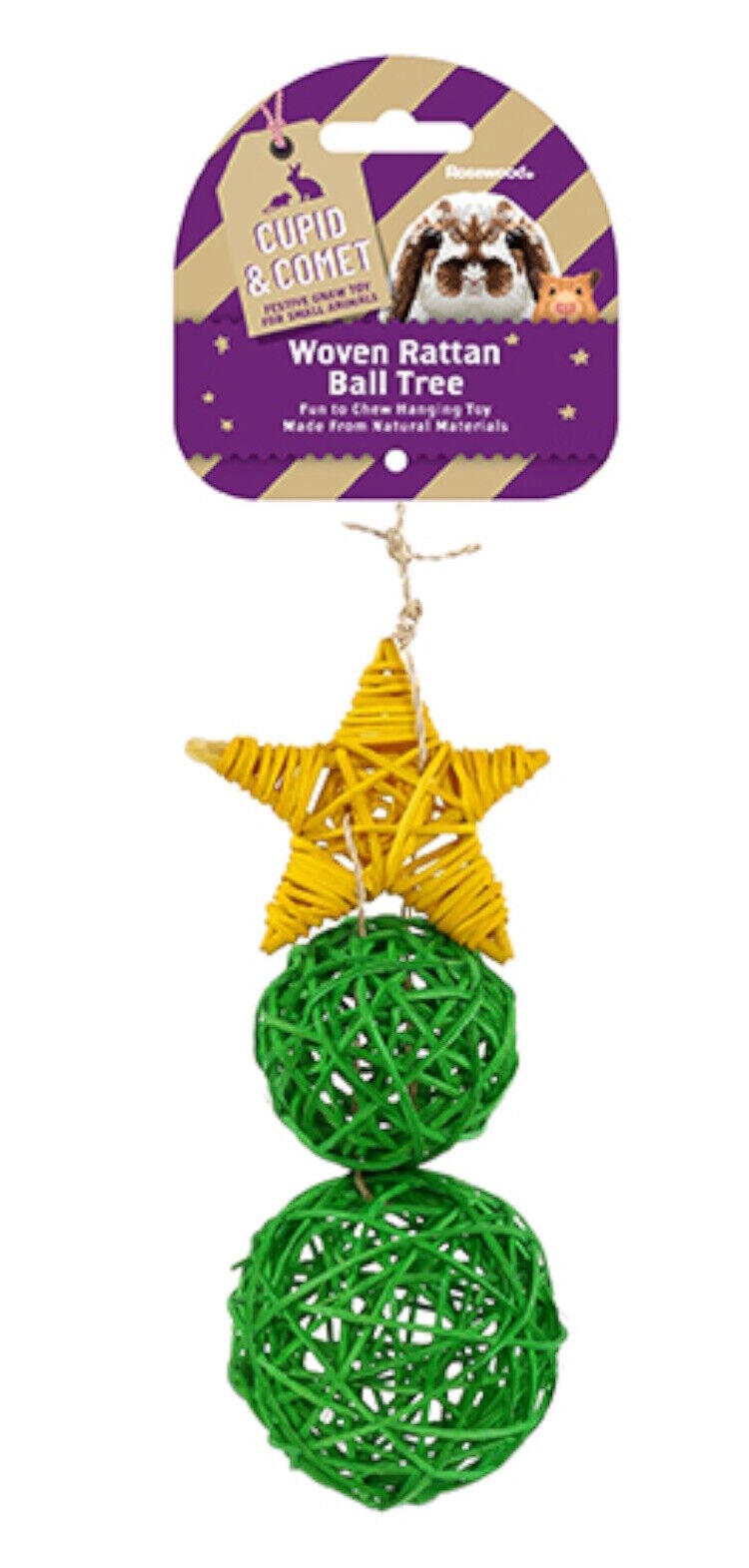 From the Rosewood range, the Woven Rattan Ball Tree is a festive and interactive toy for small animals. Made from natural rattan with no glues or metals, it can be hung in your pet’s enclosure or separated into three individual balls for hidden-foraging fun. Perfect for nibbling, gnawing, and keeping your furry friend entertained throughout the Christmas season.