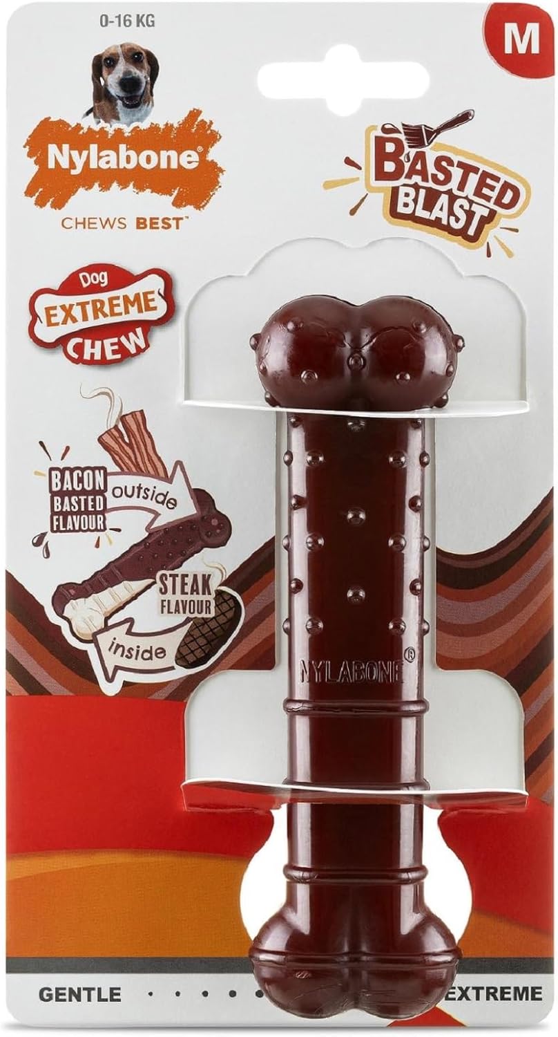 From the Nylabone range, this Medium chew toy is made for dogs up to 16kg and features an innovative basting technique that adds a second layer of flavour to an already delicious chew. With mess-free bacon flavour on the outside and a steak-flavoured inner, it keeps dogs engaged while helping to clean teeth and freshen breath as they chew. Crafted from Nylabone’s toughest material for powerful chewers, it offers long-lasting satisfaction and durable fun. Please note all measurements are manufacturer stated — whilst tough, no toy is indestructible.