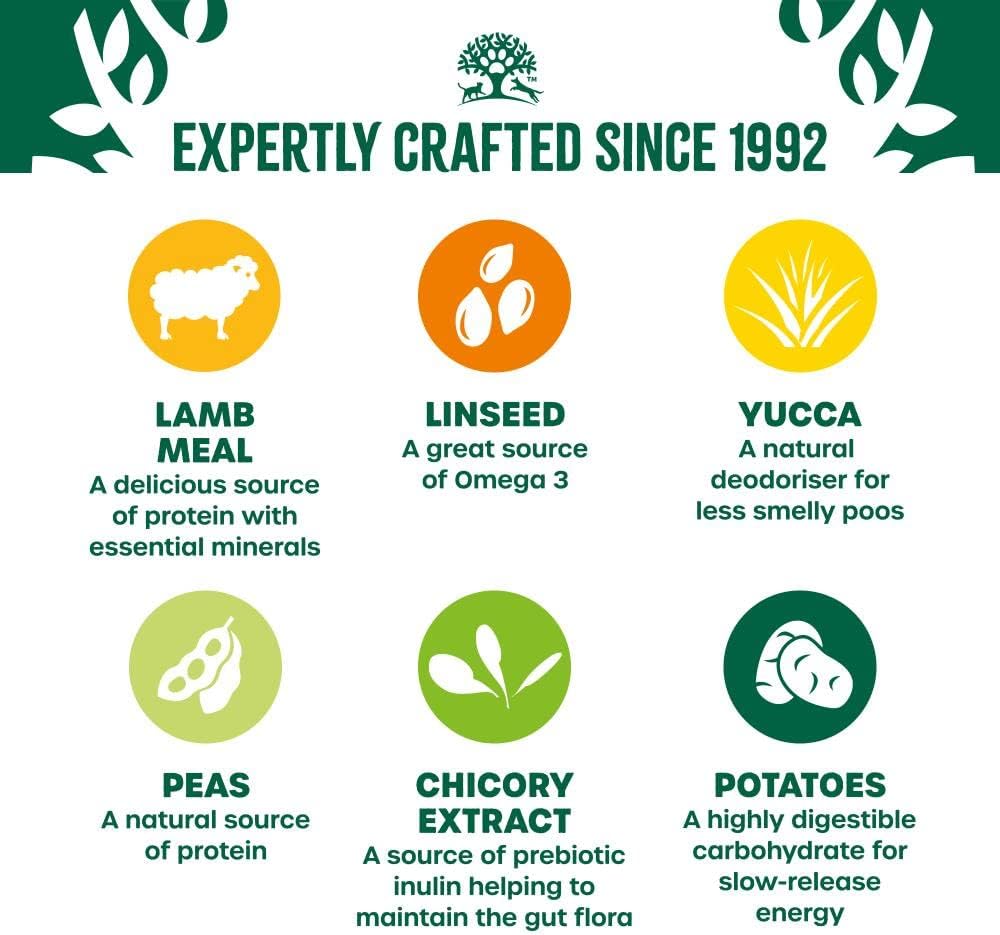 Crafted with nature's nourishing ingredients and combined with flavourful lamb to create highly digestible, tasty dry dog food. Our recipe is also made without grains for dogs with grain sensitivity. Best of all, you can be sure they're enjoying a balanced diet. One that not only tastes good but does them a world of good too.