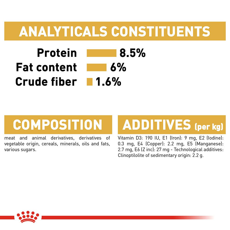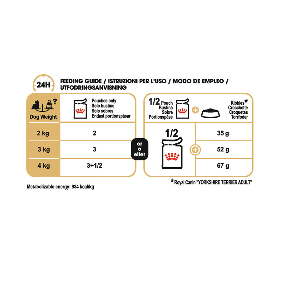 From the Royal Canin range, Royal Canin® Yorkshire Terrier in Loaf is a complete and balanced wet food tailored to meet the nutritional needs of adult Yorkshire Terriers over 10 months old. Designed with this elegant breed’s signature long, silky coat in mind, the formula includes a precise blend of nutrients that help maintain healthy skin and promote a glossy, soft coat. Crafted with high-quality ingredients and optimal levels of nutrients to support digestive health, this diet helps ensure your Yorkie looks and feels their best. Its smooth, palatable texture and enticing aroma make it perfect for even the fussiest eaters, satisfying their refined appetites while delivering complete nutrition. For variety, Royal Canin® Yorkshire Terrier in Loaf can also be paired with Royal Canin® Yorkshire Terrier dry kibble, following the feeding guidelines for a balanced mixed diet.