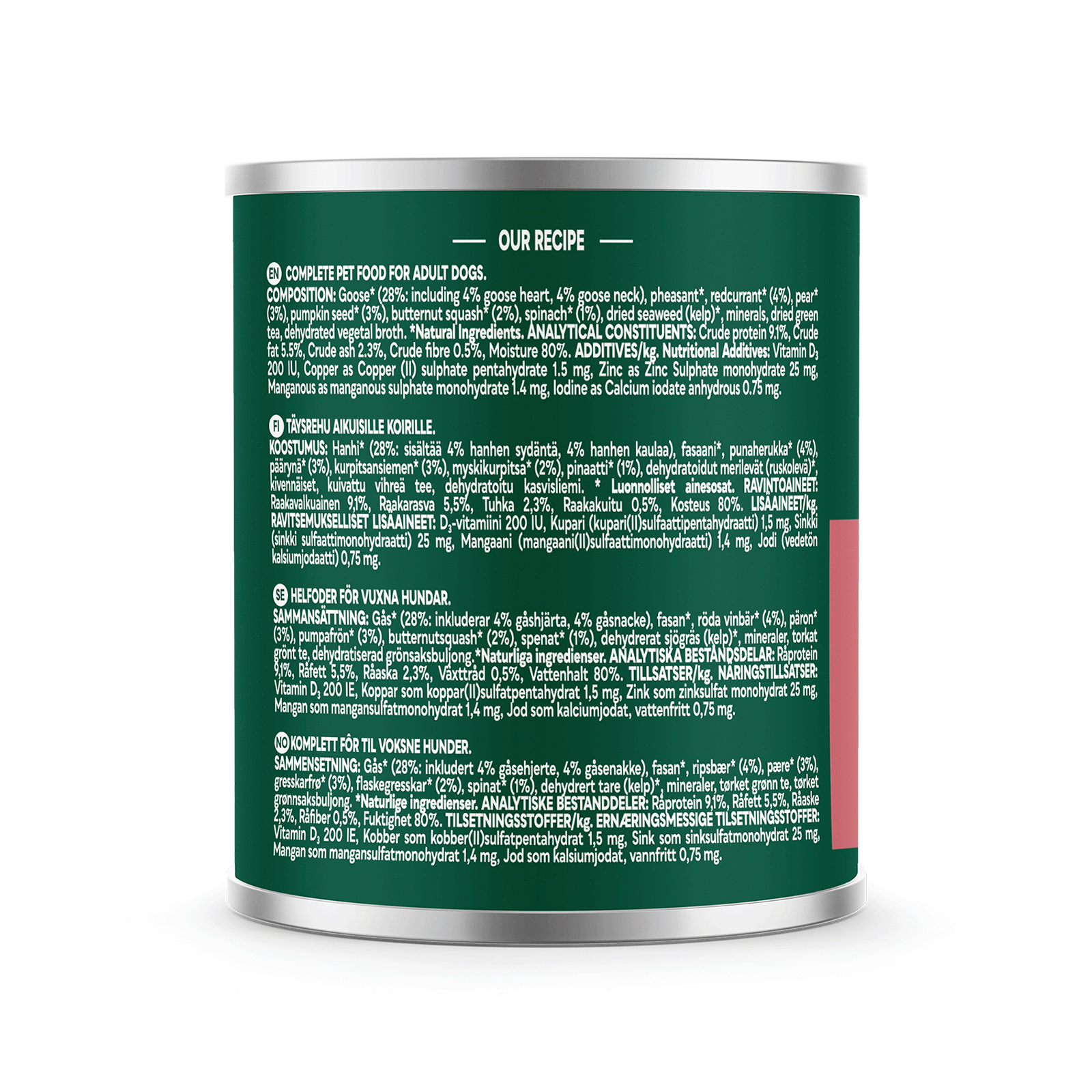 Treat your dog to a truly wild dining experience with Natures Menu Country Hunter Pheasant & Goose. This grain-free, complete and balanced meal is crafted with 80% ethically sourced meats—40% pheasant and 40% goose—blended with a medley of superfoods like redcurrants, pears, pumpkin seeds, and butternut squash. Gently steam-cooked to lock in nutrients and flavour, it's a wholesome alternative to raw feeding, especially when you're on the go. Free from meat meals, derivatives, artificial colours, and preservatives, this meal is suitable for adult dogs and puppies over 20 weeks of age. With a protein content of 11.2% and 92 kcal per 100g, it's designed to support your dog's natural vitality and well-being.