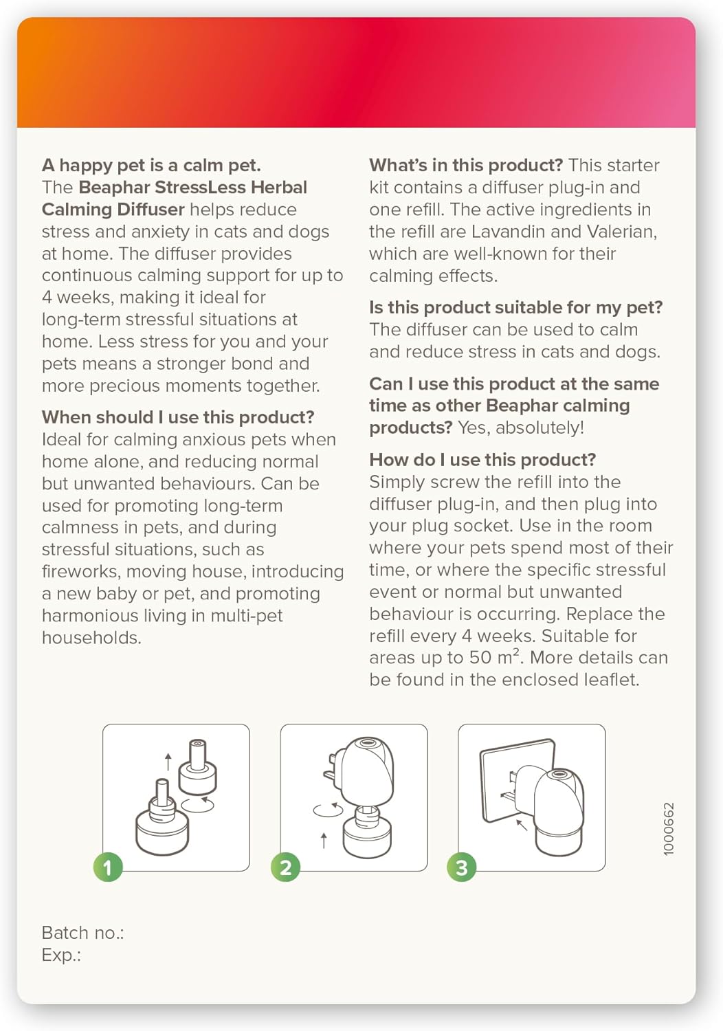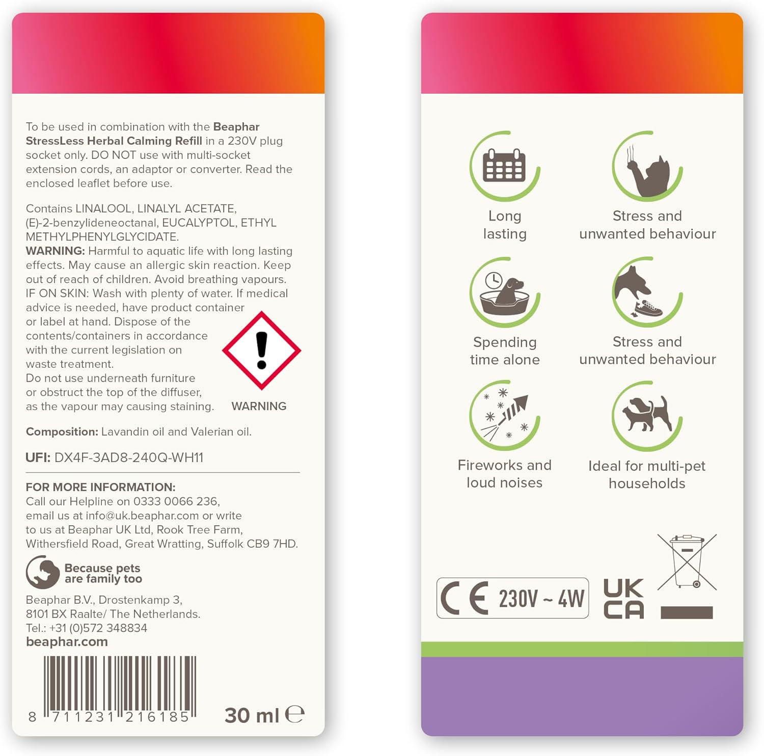 From the Beaphar range, the Calming Diffuser Plug-In is an easy-to-use solution designed to reduce stress and promote relaxation in your pet. Ideal for managing unwanted but natural behaviours such as vertical scratching, chewing furniture or objects, and urine marking, this diffuser provides long-lasting calming support for up to four weeks. It’s especially effective during stressful situations like fireworks, loud noises, moving house, introducing a new baby or pet, or encouraging harmony in multi-pet households. Simply plug it into the room your pet spends most of their time in to create a calm and comforting atmosphere.