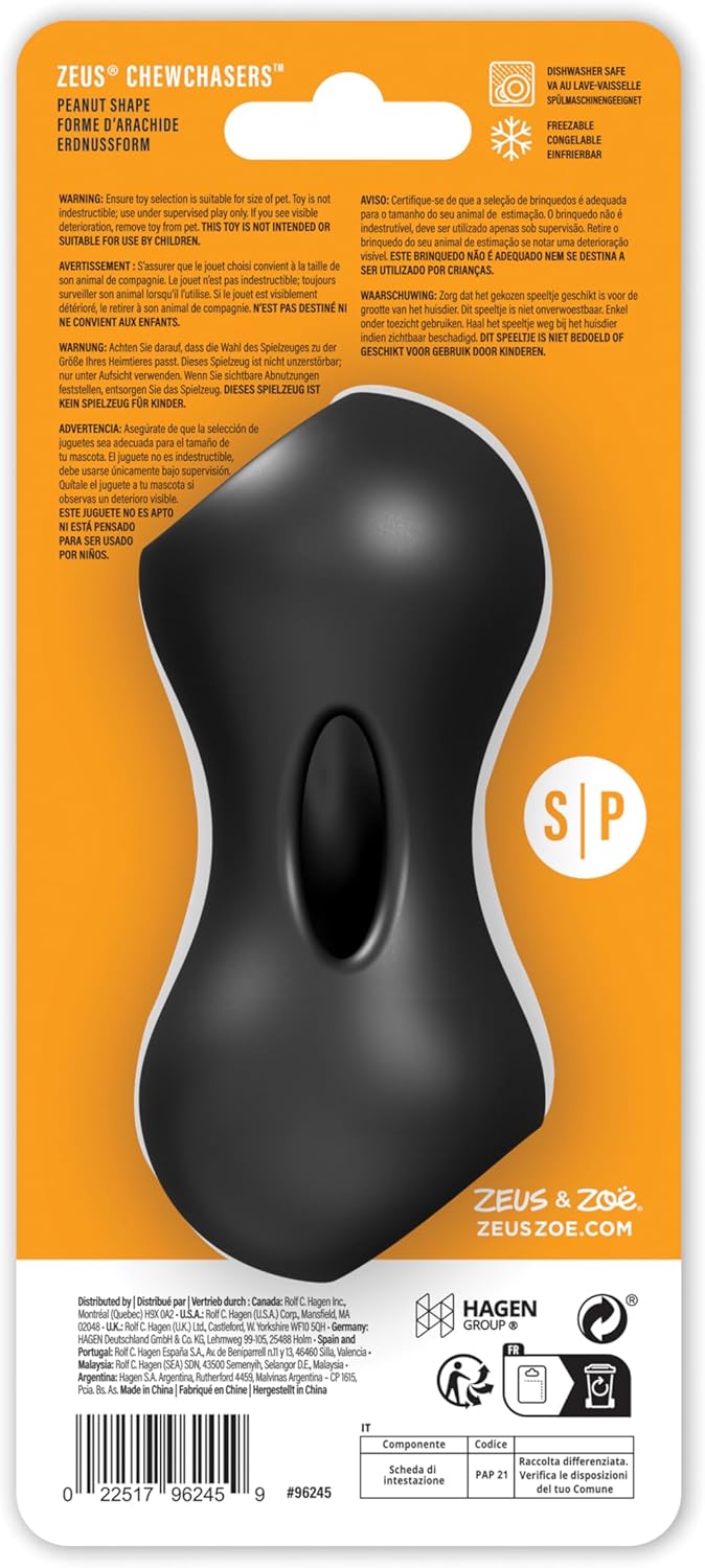 From the Zeus range, the ChewChaser Treat Peanut in black (11cm) is made from food-grade natural rubber with rounded edges and ridges that are gentle on your dog’s gums. Designed to be filled with treats, it helps relieve boredom, reduce destructive behaviour, and satisfy natural chewing instincts. Dishwasher safe and suitable for freezing with goodies to keep dogs cool on hot days, this durable toy is perfect for interactive play and long-lasting enjoyment.