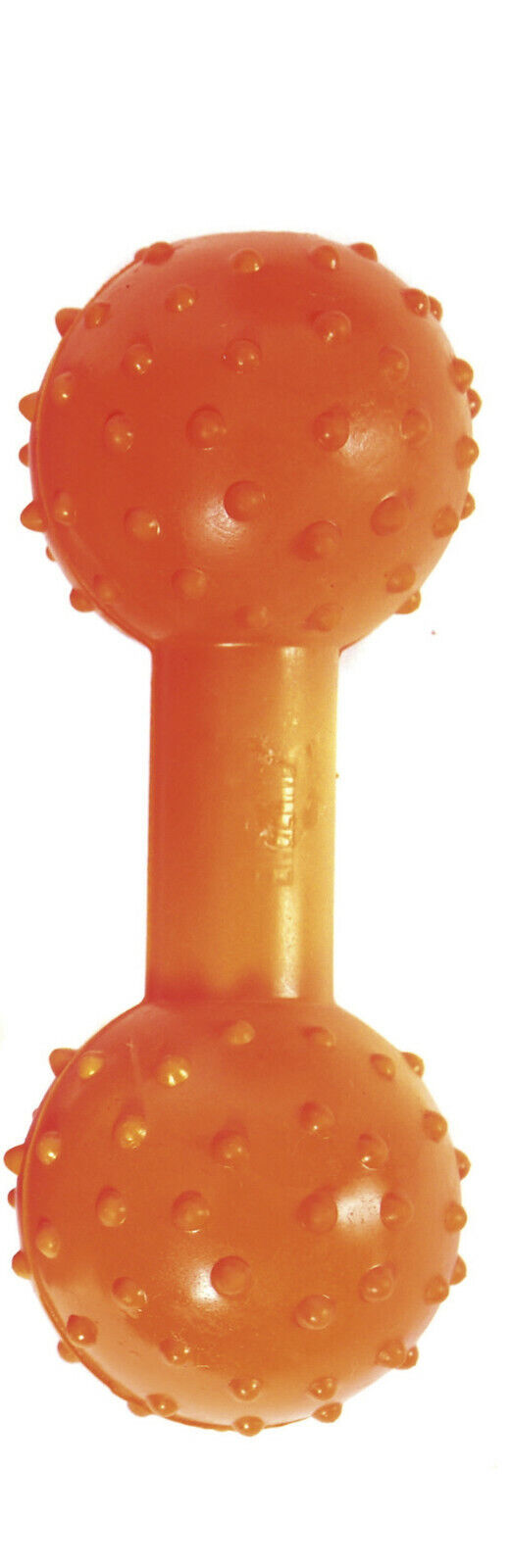 A great tough toy for any dog, made from safe and long-lasting natural rubber. Designed in a fun dumbbell shape, it helps prevent boredom and encourages healthy chewing habits. The studded textured ends provide extra grip and stimulation that your dog will love to chew on. Size: 4.5 inches. All measurements are approximate. Please note colours may vary.