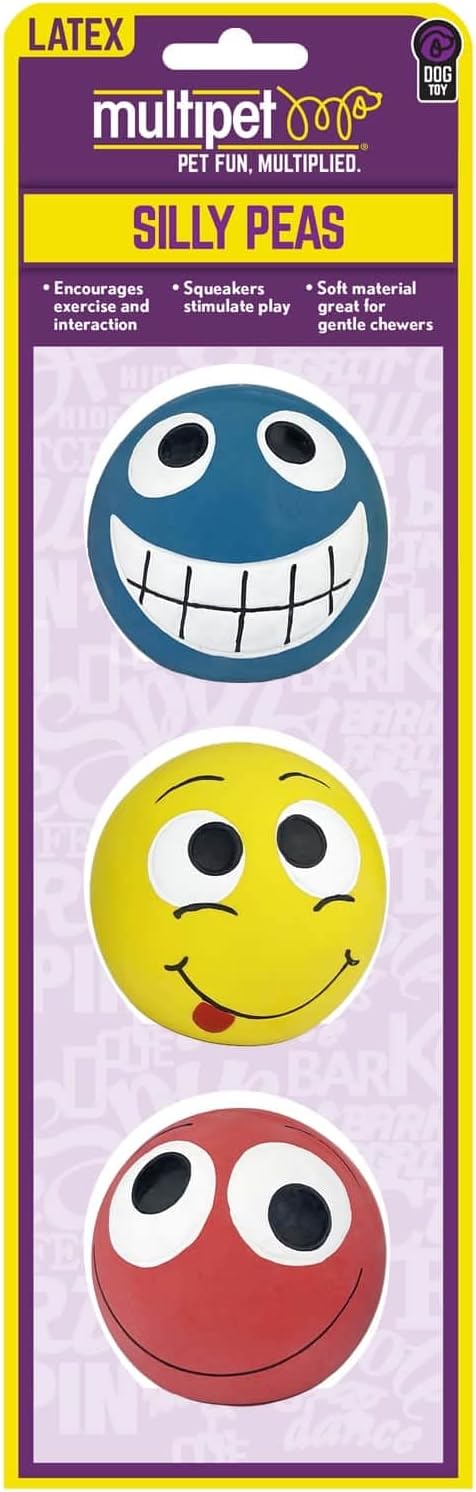 From the Multipet range. 3 balls total. Silly squeakers latex face balls, perfect for small dogs & puppies who love to play. Encouraging exercise & interaction with games such as fetch. With a squeaker for stimulating play & sparking curiosity from your pet. Soft material great for gentle chewers. Diameter: 5.5 cm.