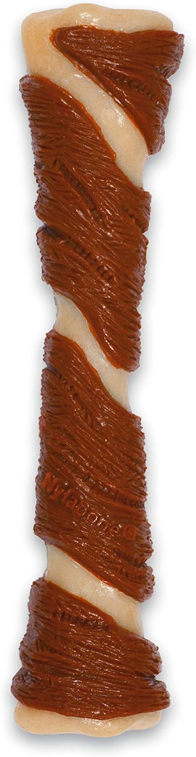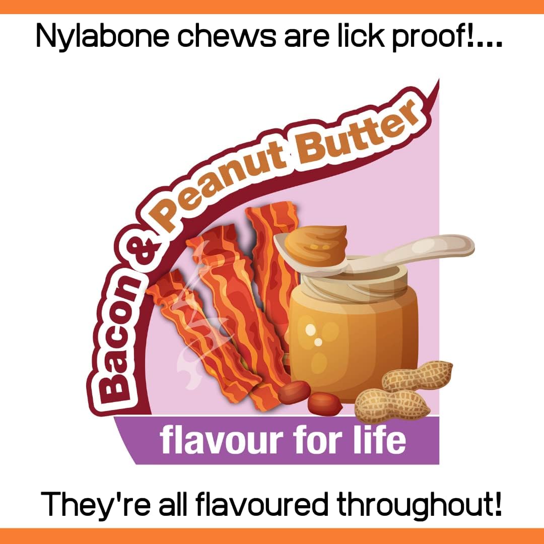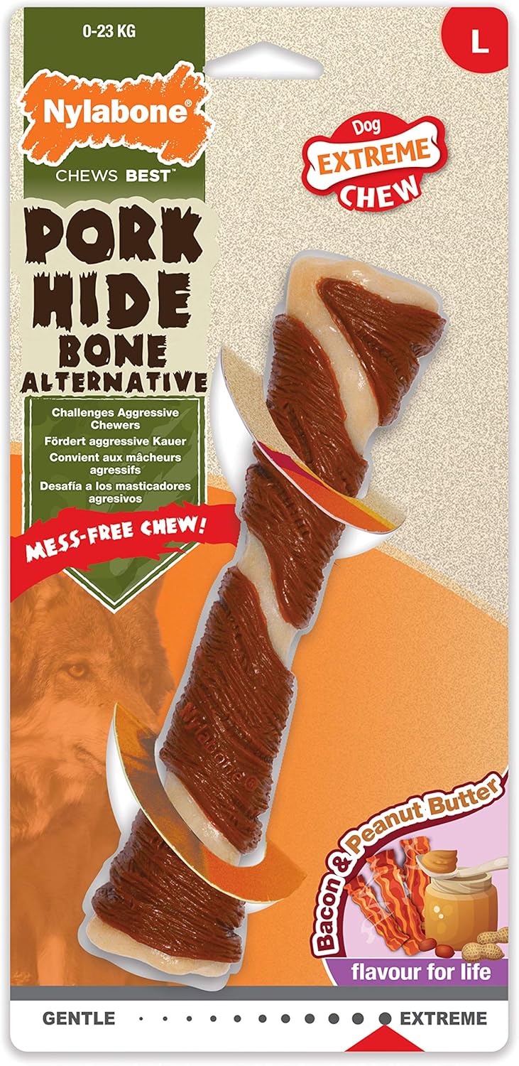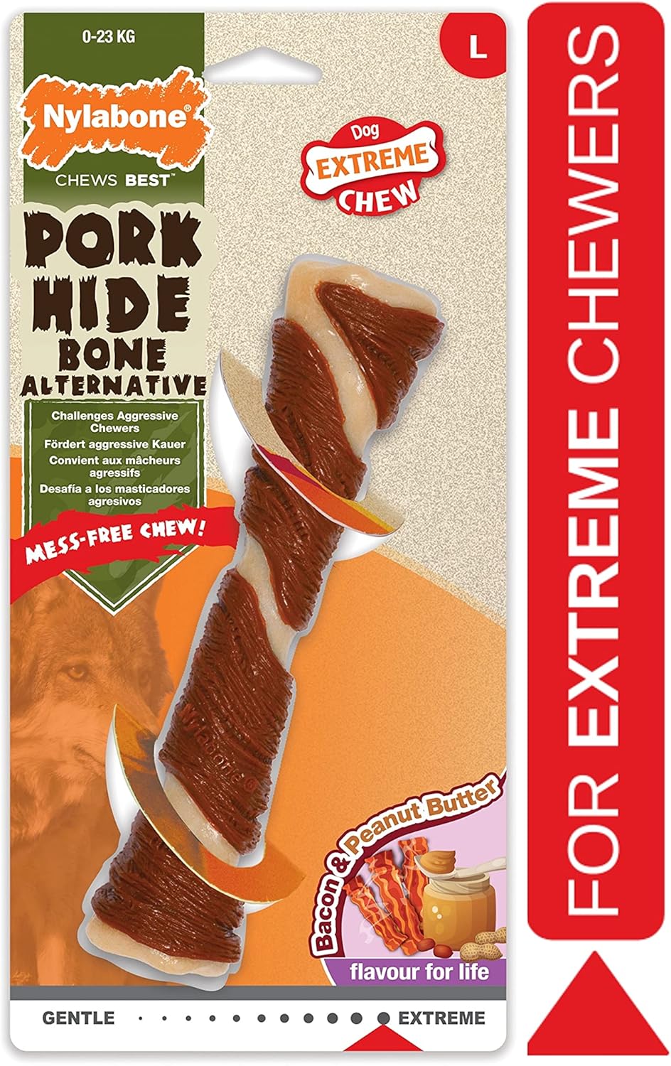 Nylabone alternative provides toy which look natural but don't cause the same mess. Sure to prevent boredom & satisfies your pets urge to chew. Long lasting & mess-free. Clean & safe chews. Bacon & peanut butter pork hide bone for dogs up to 23kg.