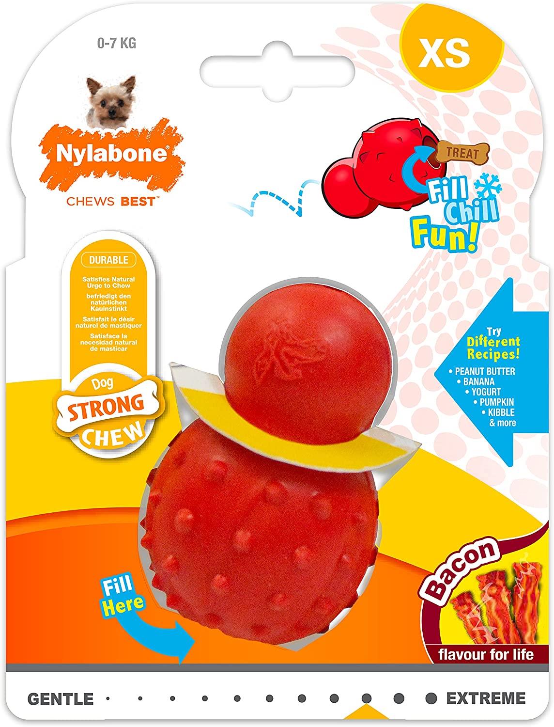 From the nylabone range. Made with natural rubber. Sure to provide hours of fun. With hollow inner to be stuffed with all sorts of treats. Ideal for dogs who love to play. X small up to 7kg.