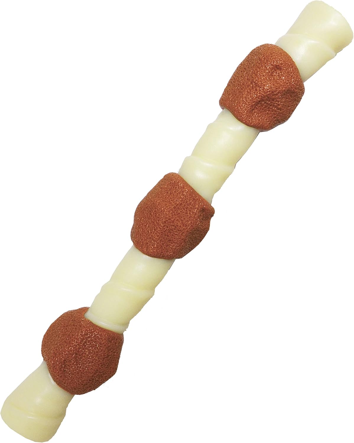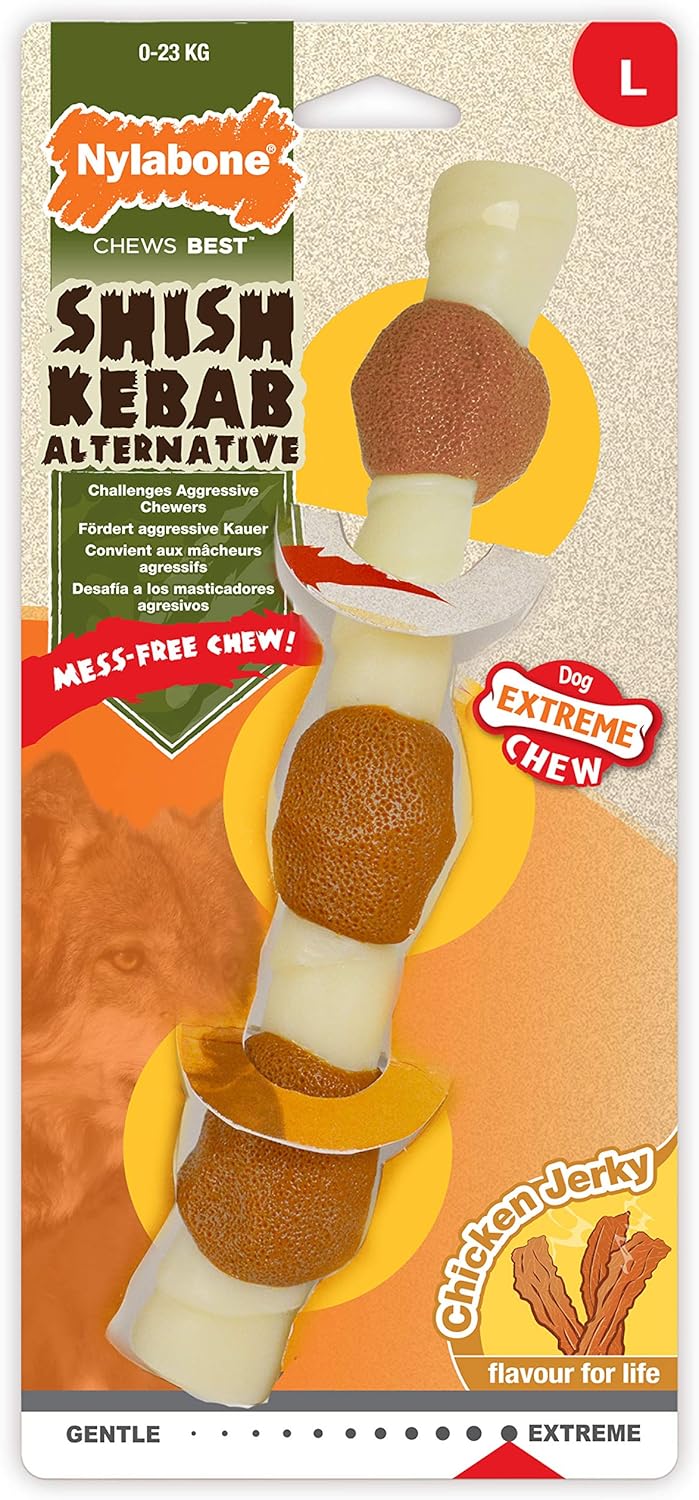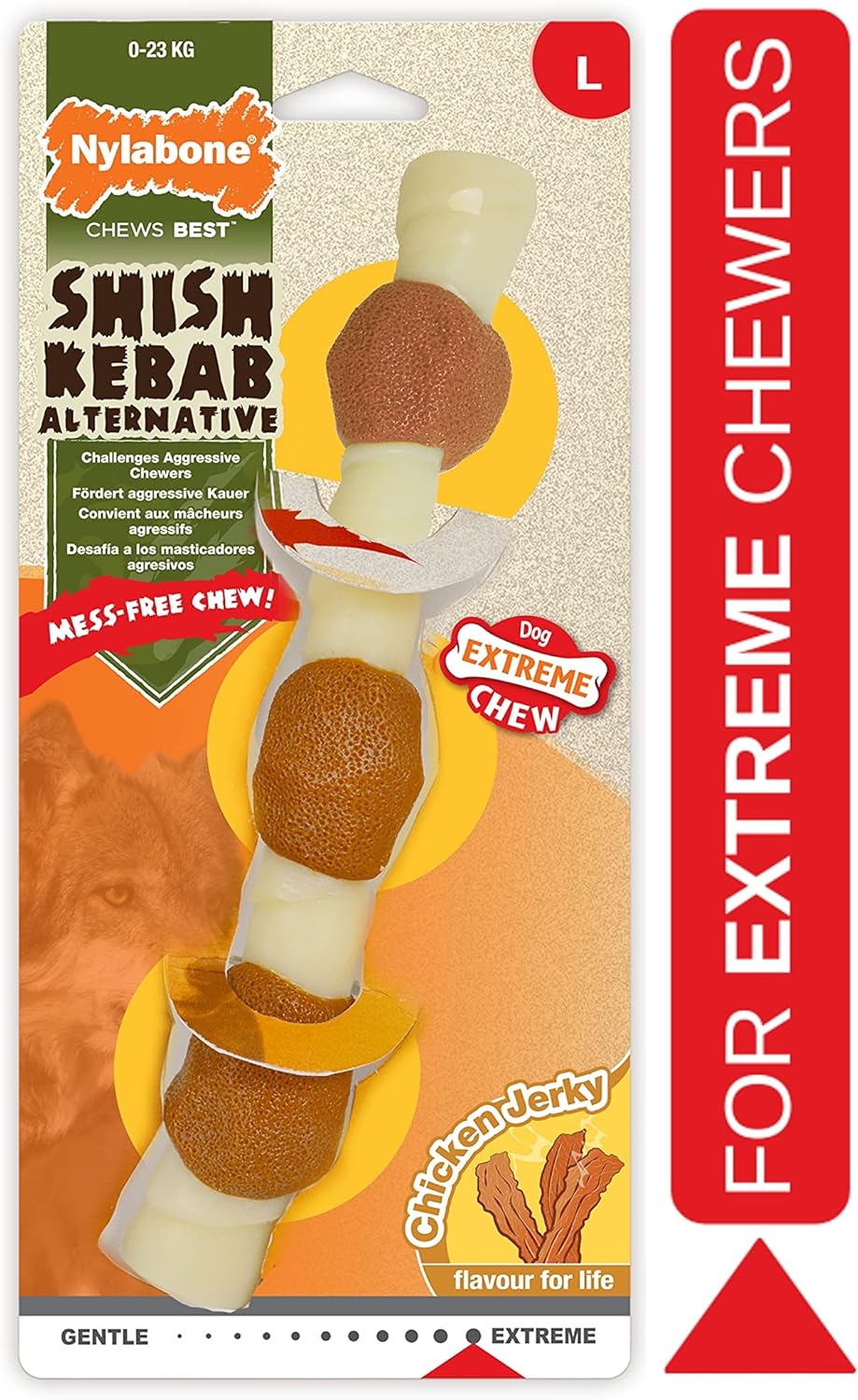 From the nylabone range. Fun style shish kebab. Mess-free chew. Chicken jerky flavour( made with non-animal ingredients). Long lasting. Tough & durable chew toy. Challenges aggressive chewers. Sure to provide fun & prevent boredom. Large for dogs up to 23 kg.