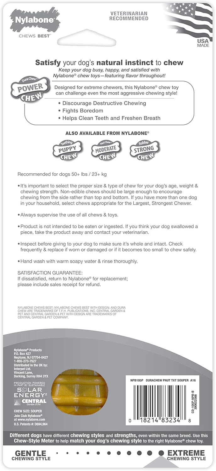 Perfect for any strong chewer. In a tasty peanut butter flavour for your pet. Made of tough nylon to ensure a long lifetime. Satisfies natural urges to chew and combats boredom. Sure to keep your pet entertained for hours. Bristles raised during chewing help clean teeth. Souper (up to 23kg+).