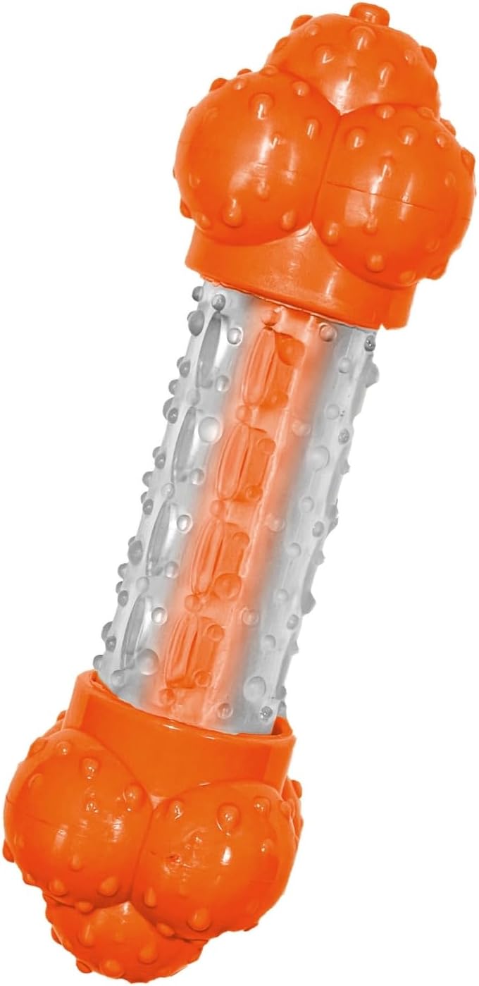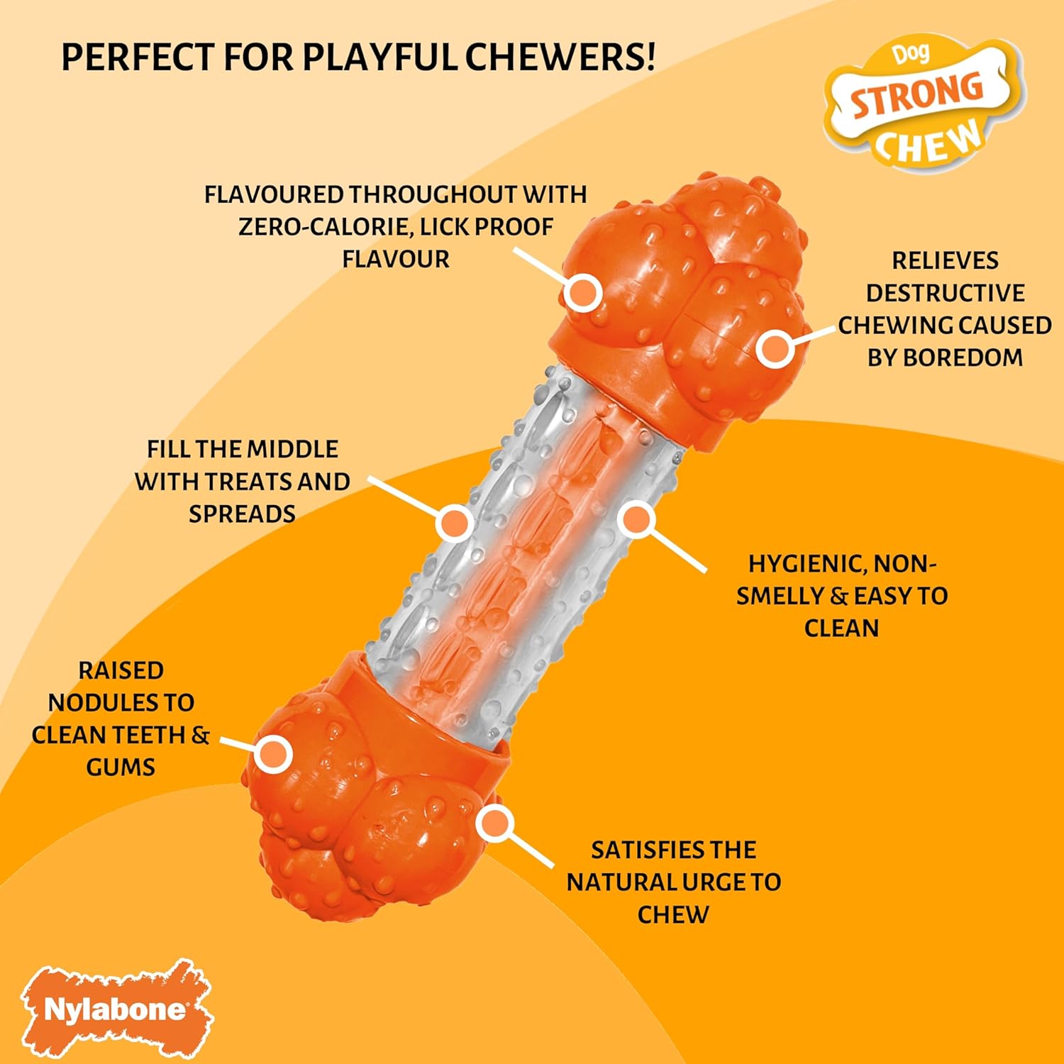 From the nylabone range. Perfect for filling with snacks & spreads such as soft treats, peanut butter, yoghurt & much more. An interactive toy that slowly releases treat bits & an enticing scent as your dog chews the centre, keeping them busy longer. Helps to clean teeth, with multiple textures to help clean teeth & freshen breath. With lifelong bacon flavoured chewing ends & a flexible centre. Ideal for all small to medium dogs 0-16kg. Measurements: 15 x 4.5 cm.
