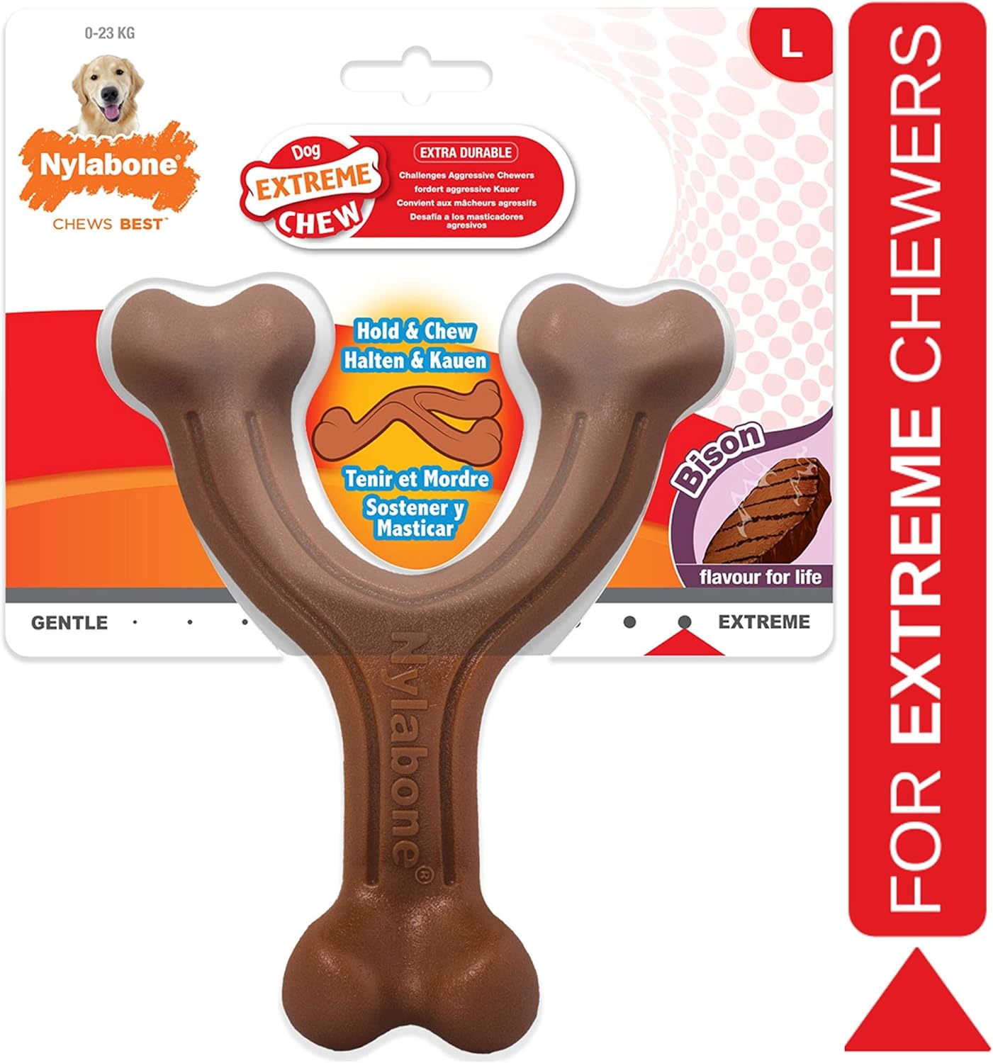 A great new toy from nylabone. Bison flavour. A great new toy design. Extra durable. Challenges aggressive chewers. Bison flavour throughout the life of the toy. Small 0 - 11 kg.