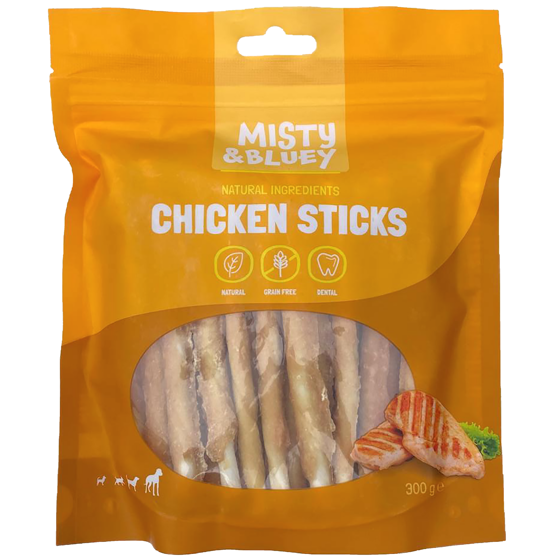 From the Misty & Bluey range, these Chicken Sticks Value Bags are made with natural ingredients and a delicious blend of 49% chicken and 48% beef skin for a wholesome, high-protein treat your dog will love. Low in fat and completely free from artificial colours, flavours, and preservatives, they’re 100% natural, grain-free, and even help support dental health. Packaged in a recycled, re-sealable bag for lasting freshness, these tasty sticks are perfect as a daily reward for all dogs and puppies over 4 months old. Weight: 300g per pack. Please note all measurements are manufacturer stated.