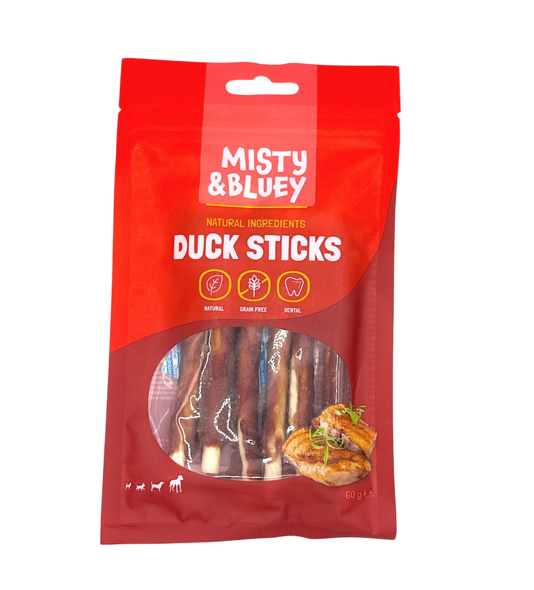 From the Misty & Bluey range, duck sticks are a super tasty, grain-free treat made with natural ingredients for your four-legged friend to enjoy. Made with over 49% duck and 48% beef skin, these treats are ideal as a daily reward and suitable for all dogs and puppies over 4 months old. Supplied in a 60g pack. Please note all measurements and weights are manufacturer stated.