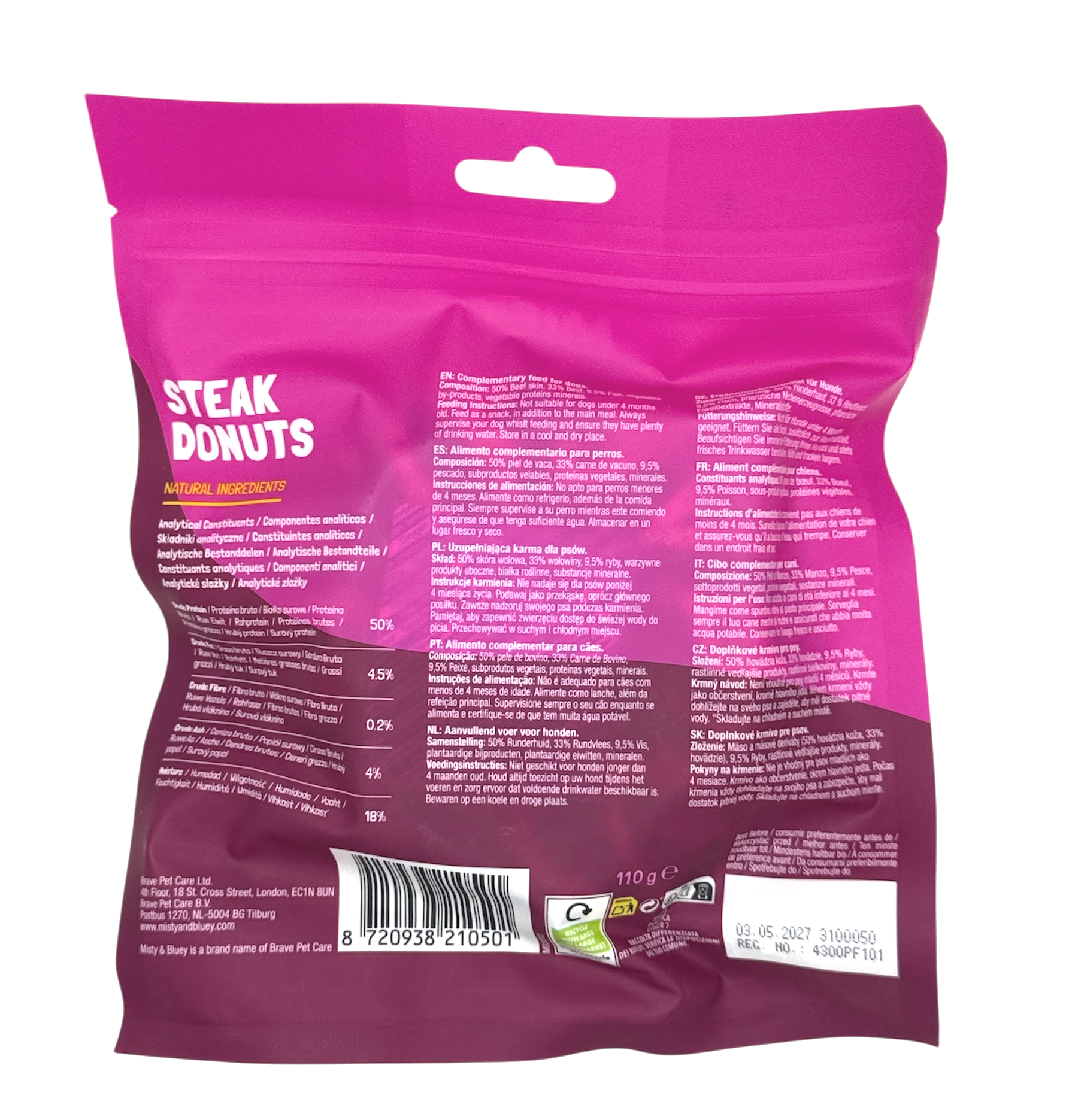 From the Misty & Bluey range, the steak donut is a super tasty, grain-free treat made with natural ingredients for your four-legged friend to enjoy. Made with a balanced recipe including 50% beef skin, 33% beef, 9.5% fish, vegetable by-products, vegetable proteins, and minerals, it is ideal as a weekly reward and suitable for all dogs and puppies over 4 months old. Supplied in a 110g pack. Please note all measurements and weights are manufacturer stated.