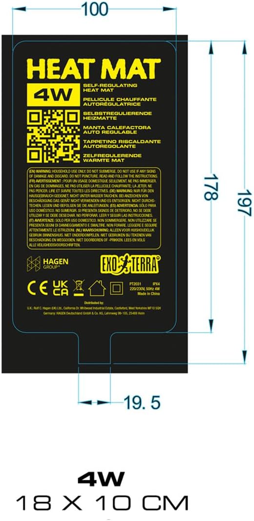 From the Exo Terra range, the 4W Heat Mat is a safe and energy-efficient conductive heat source designed for small glass terrariums. Measuring 18 x 10cm, it provides gentle, uniform heating that supports thermoregulation in reptiles, amphibians, and invertebrates. With a fast warm-up, self-regulating maximum temperature, and IPX6 water resistance, this rugged mat improves safety and reliability while helping maintain ambient temperature without hot spots.