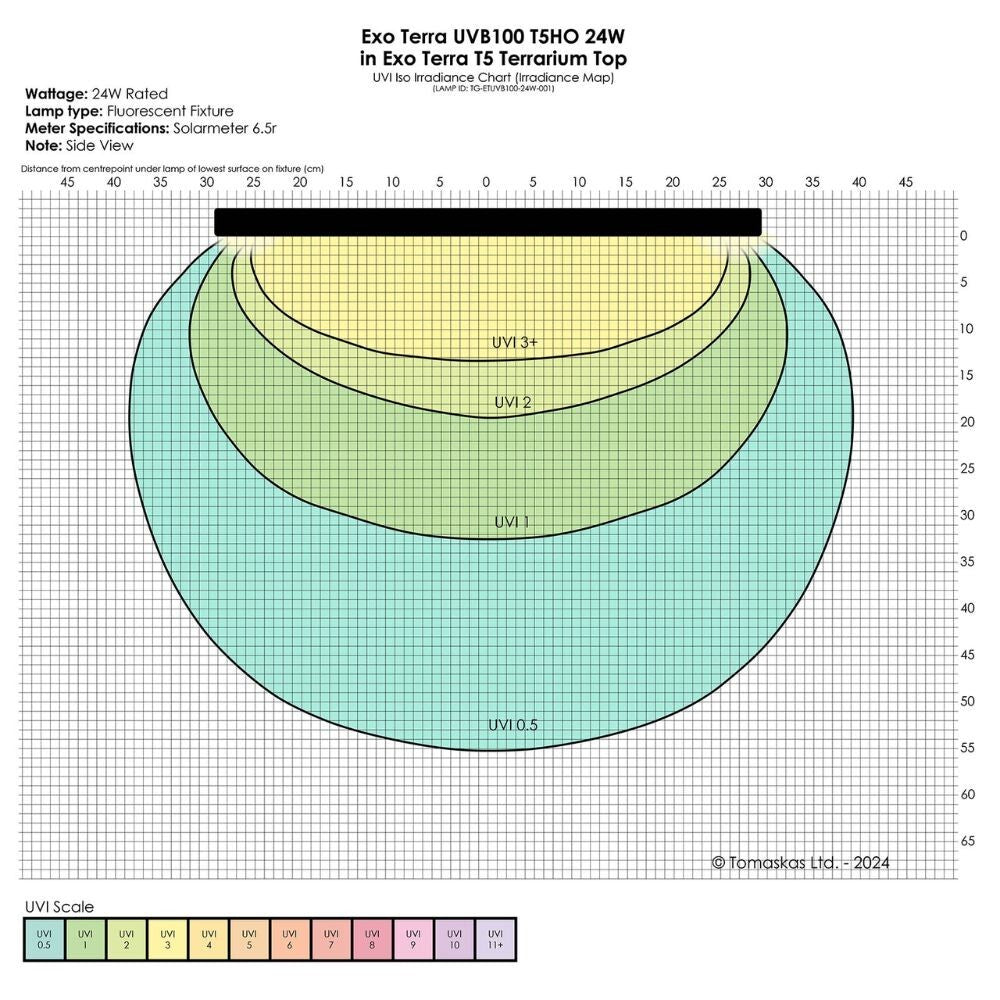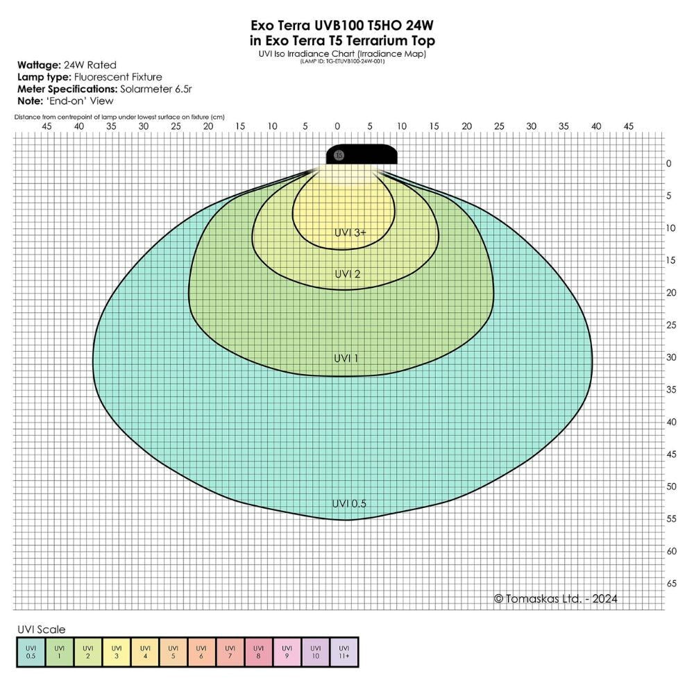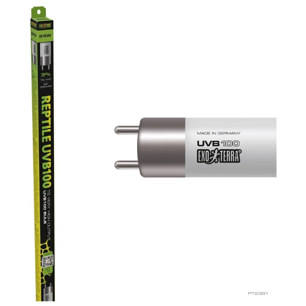 From the Exo Terra range, the Reptile UVB100 T5 VHO 24W 22" bulb delivers powerful, long-lasting UV lighting with a consistent output that remains effective for 12+ months. Combining strong UVA and UVB rays with a well-balanced visible spectrum, it is specifically designed to support the natural needs of reptiles, amphibians, and invertebrates. This bulb helps promote healthy Vitamin D3 synthesis to aid calcium absorption, while UVA exposure encourages essential behaviours such as appetite, activity, and reproduction. Ideal for all terrarium setups, the UVB100 (3%) output provides the appropriate UV level for species with moderate UV requirements. Please note: measurements are manufacturer stated.
