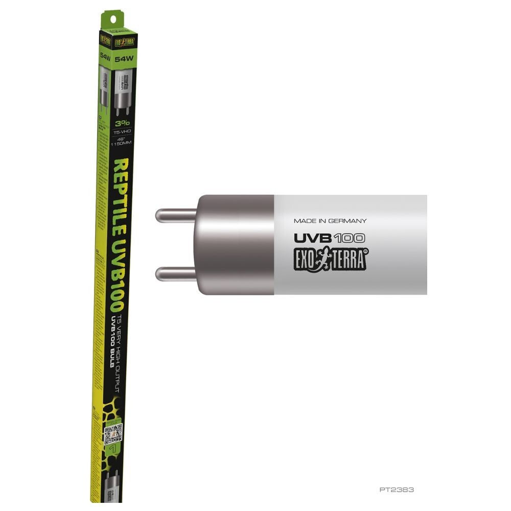 From the Exo Terra range, the Reptile UVB100 T5 VHO 54W 46" bulb delivers high-intensity, long-lasting UV lighting engineered to maintain strong output for 12+ months. Combining powerful UVA and UVB rays with a well-balanced visible spectrum, it is designed to support the natural biological needs of reptiles, amphibians, and invertebrates. This bulb promotes healthy Vitamin D3 synthesis to aid efficient calcium absorption, while the UVA levels help stimulate appetite, activity, and reproductive behaviours. Suitable for all terrarium environments, the UVB100 (3%) strength provides the ideal UV exposure for species with moderate UV requirements. Please note: measurements are manufacturer stated.