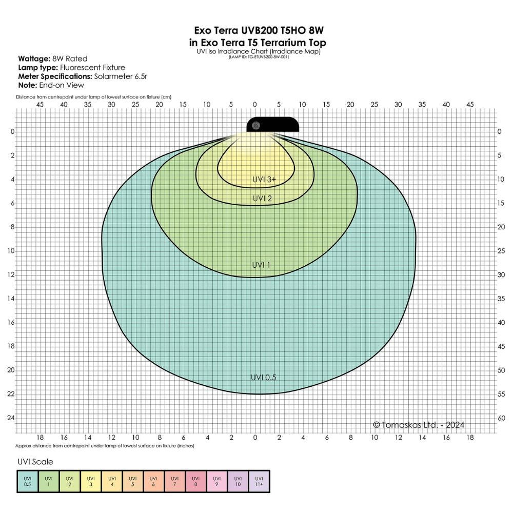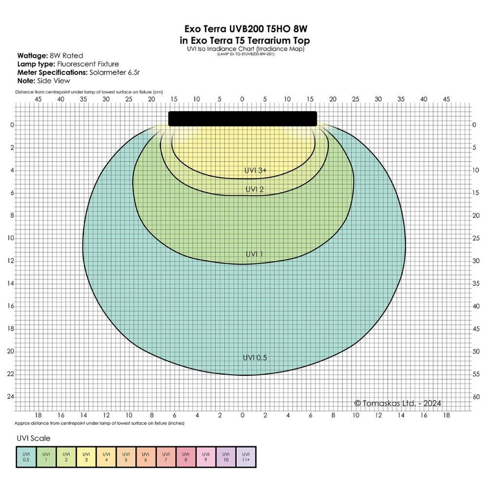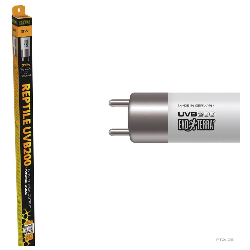 From the Exo Terra range, the Reptile UVB200 T5 VHO 8W 12" bulb provides an exceptionally strong UVB output designed for reptiles with high UV requirements. Offering intense UVB rays alongside a balanced spectrum of UVA and visible light, it supports optimal Vitamin D3 synthesis and efficient calcium absorption—making it ideal for desert or sun-loving species. The UVA component also promotes natural behaviours such as appetite, activity, and reproduction. Engineered for long-lasting performance, this bulb maintains effective UV output for 12+ months and is suitable for use with all terrarium setups. The UVB200 (7%) level ensures enhanced UV exposure for species that thrive under stronger light. Please note: measurements are manufacturer stated.