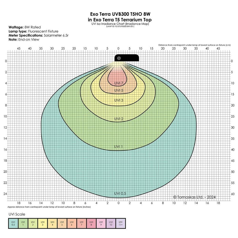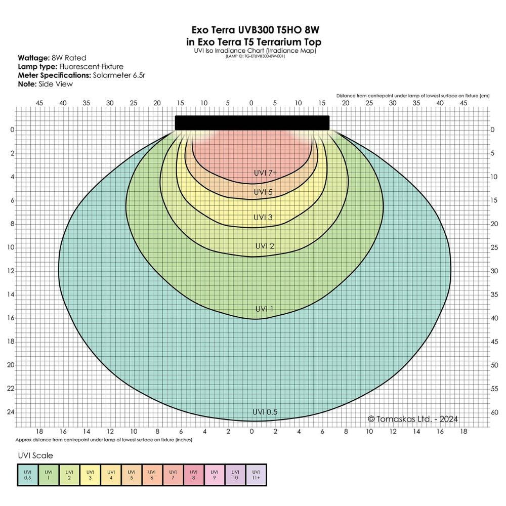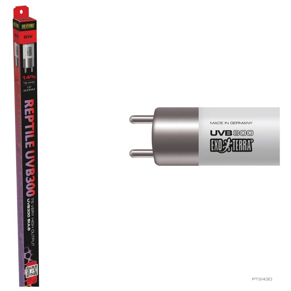 From the Exo Terra range, the Reptile UVB300 T5 VHO 8W 12" bulb provides maximum UVB output for reptiles requiring very high levels of UV exposure. Delivering intense UVB alongside balanced UVA and visible light, it promotes optimal Vitamin D3 synthesis and efficient calcium absorption—ideal for desert and sun-loving species. The UVA component also supports natural behaviours such as appetite, activity, and reproduction. Engineered for long-lasting performance, this bulb maintains effective UV output for 12+ months and is suitable for all terrarium setups. The UVB300 (14%) output ensures the highest level of UV exposure for species that thrive under strong light. Please note: measurements are manufacturer stated.