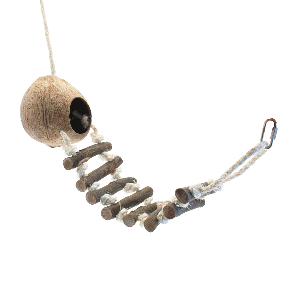 From the nature first range. Natural coconut hide with ladder. Coconut hide to provide a safe place for your pet to rest & relax. 2 clips for easy attachment to most cages. Ideal for small animals such as gerbils, hamsters, chipmunks & degus. Fantastic toy for nibbling & keeping teeth healthy & trim. Measurements: 72 cm x 11 cm.