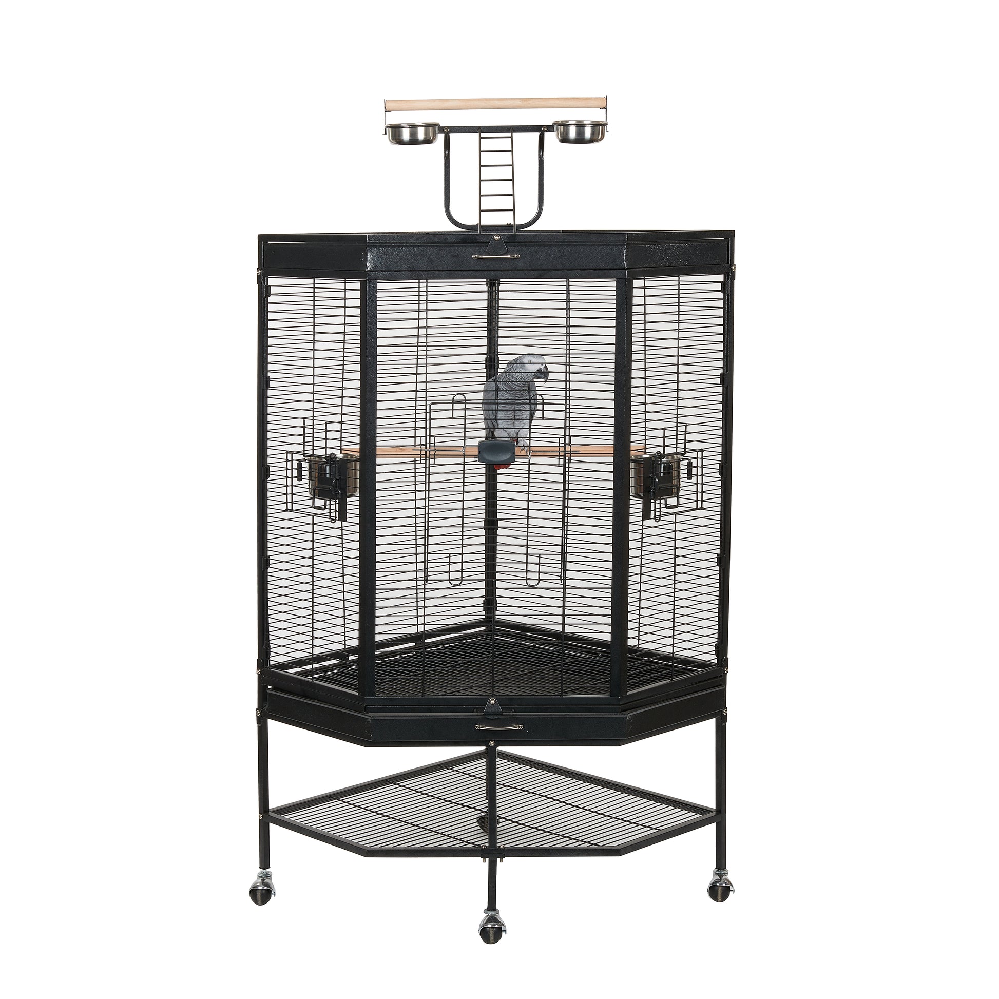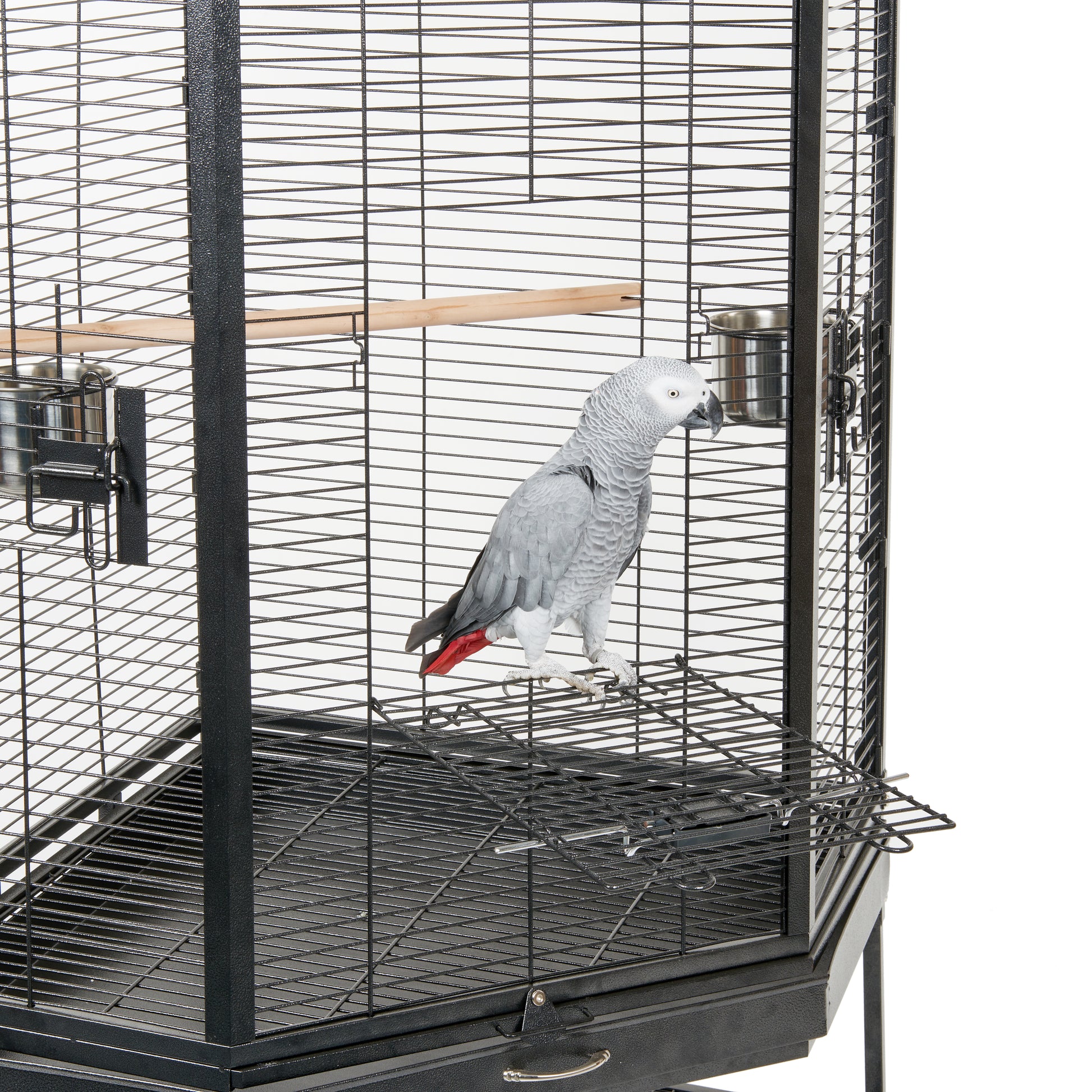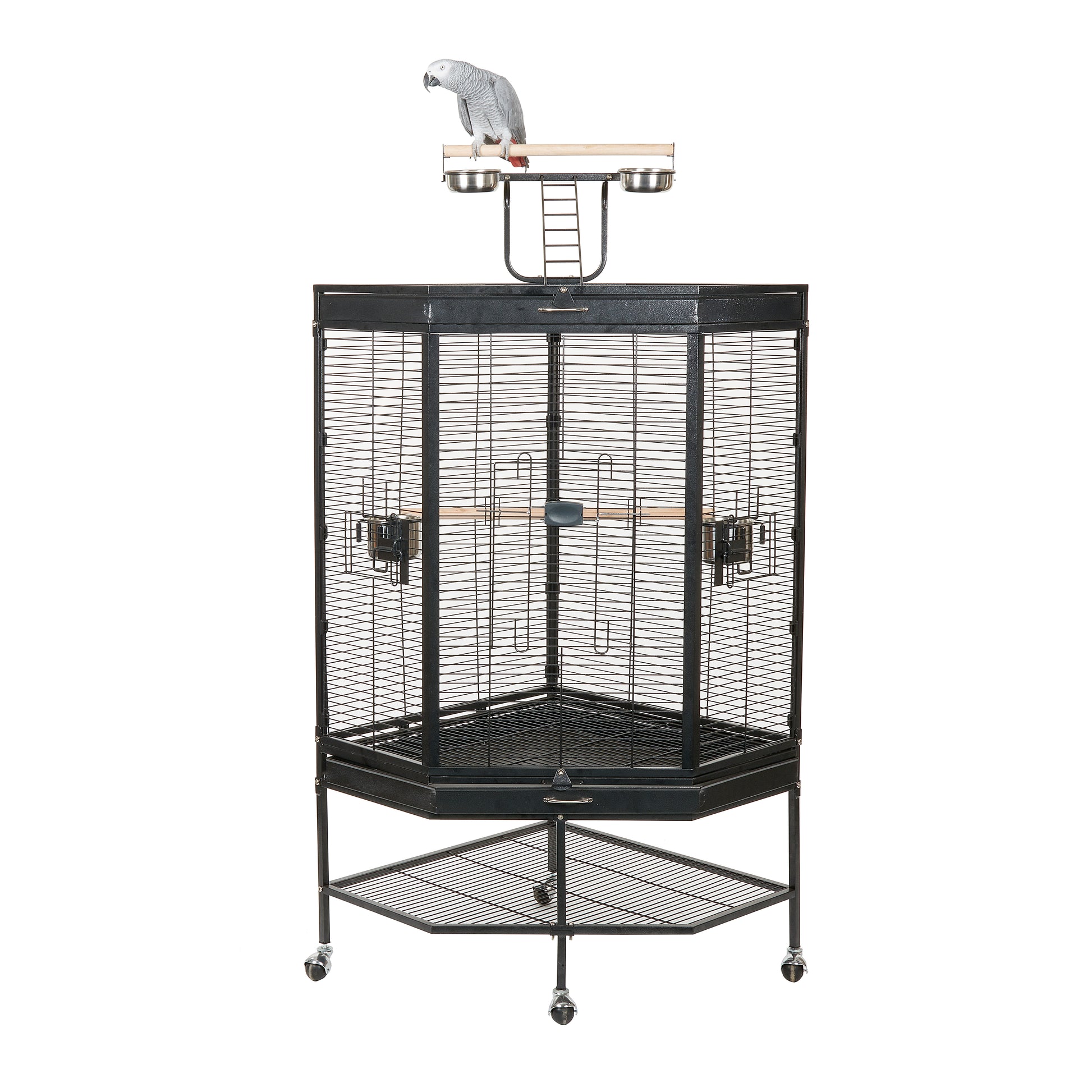 From the liberta range. Alaska large corner cage with playtop for medium parrots. Made from high quality wrought iron with a non-toix powder coat antique black finish, sure to look good in any home. Ideal for birds sucha as african greys, amazons, small macaws, small cockatoos, senegals, caiques, alexandrines & other similar sized birds. On wheels for easy movement around your home. With pull out tray for easy maintenance when cleaning. Large opening door for easy access to all areas of your pets cage. Features a playtop with ladder, perch & 2 feeder bowls where your feathered friend can stretch their wings. With an inner perch & 2 bowls for food & water. Measurements: External: Width: 94 cm Depth: 70 cm Height: 168 cm. Internal: Width: 92 cm Depth: 68 cm Height: 100 cm. Bar spacing: 1.5 cm. Wire strength: 2 mm.