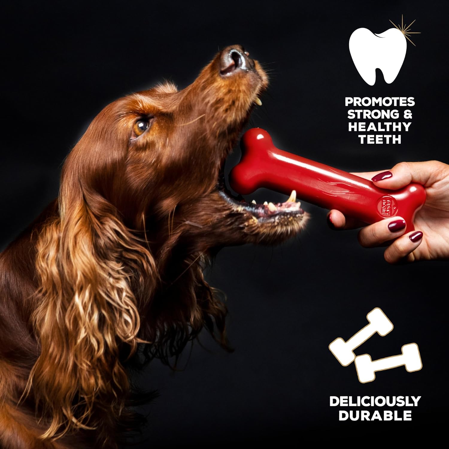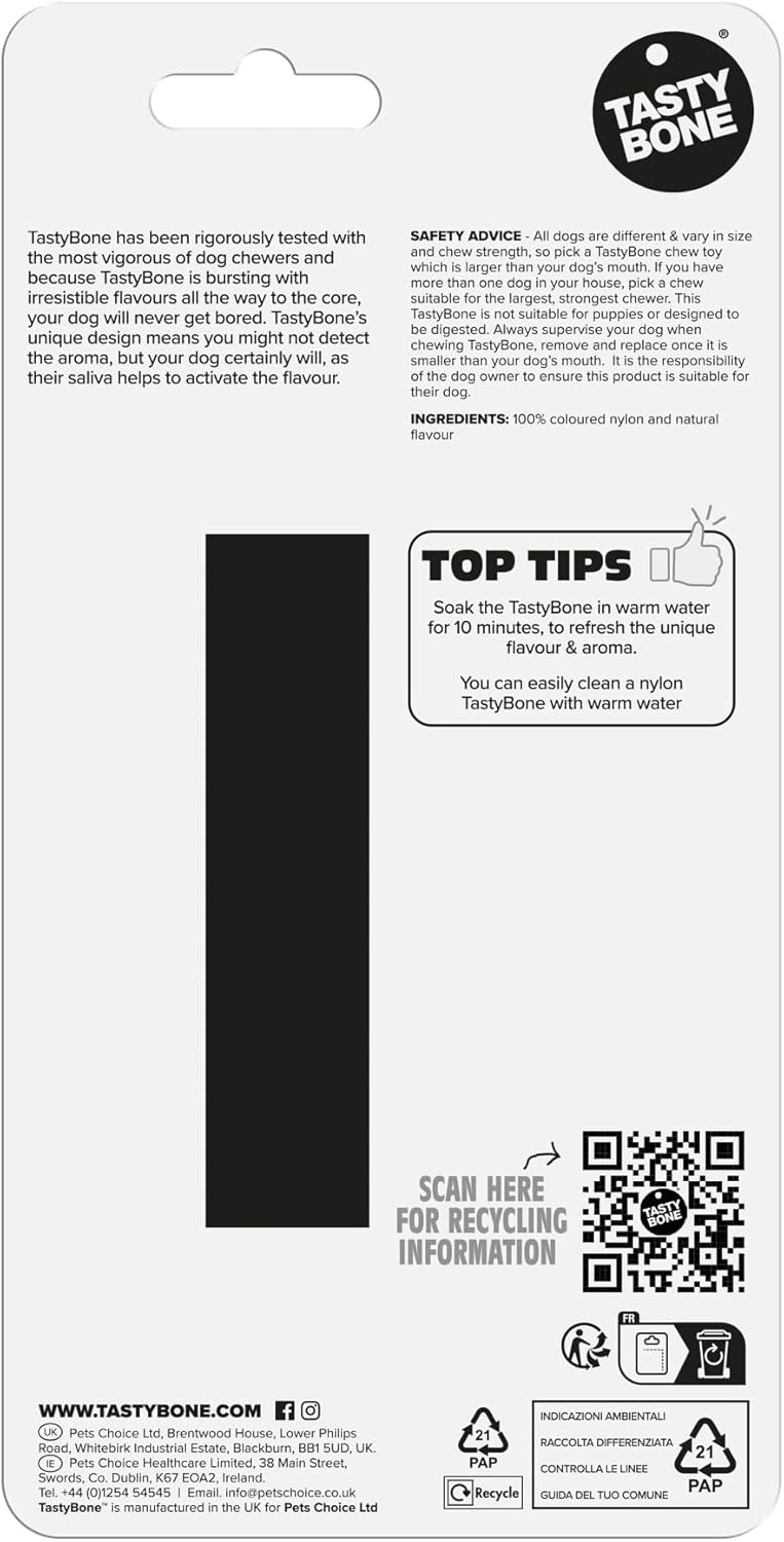 Designed for large dogs. A nylon bone that is hard wearing and full of flavour. A great way to help prevent boredom for your dog. Nylon bristles raised during chewing may help to keep your pets teeth clean. Strengthens teeth and gums. Flavour infused throughout the entire bone to keep your pet chewing happily. Measurements: Length: 17 cm Width: 6 cm.